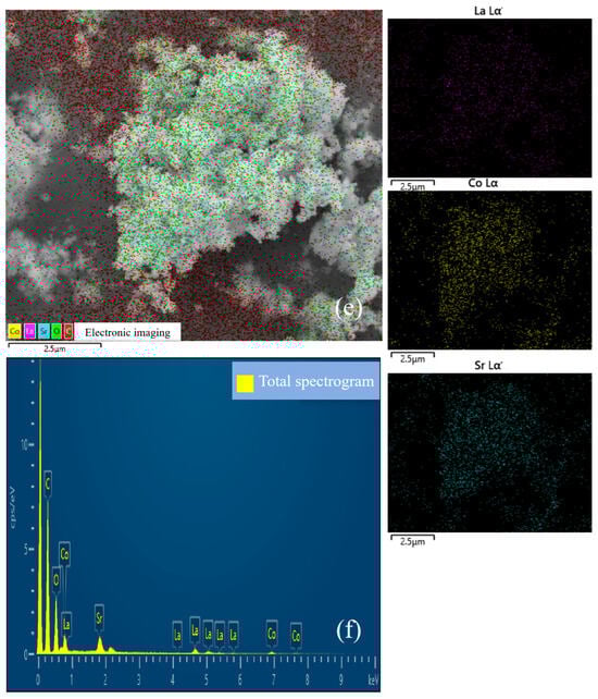 The energy-dispersive X-ray spectroscopy (EDS) mapping of LS0 and LS5 catalysts is shown in Figure 2c,e, revealing the uniform distribution of La, Sr, Co, and O atoms across their respective surfaces. Furthermore, the distribution diagram depicted in Figure 2d,f facilitates the determination of the (La + Sr)/Co ratio on the catalyst surfaces, which aligns with the theoretical outcomes as illustrated in Table 1.