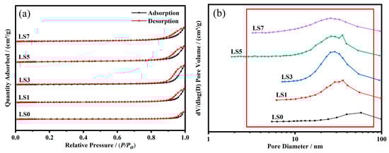 In Table 1, the LSX catalysts are characterized by their BET surface areas (SBET), pore volume (Vp), and average pore size (Dp). Among them, the LS0 sample possesses the smallest surface area of 5.58 m2/g and a corresponding pore volume of 0.05 cm3/g. Through Sr doping, the LSX catalysts exhibit an increasing trend in both surface area and pore volume with the escalating Sr doping amount, while the pore size demonstrates the opposite relationship. The LS5 sample demonstrates the largest surface area of 17.71 m2/g, coupled with a pore volume of 0.11 cm3/g. However, as the Sr doping content further rises (X = 7), LS7 experiences a slight reduction in both surface area and pore volume. This may be due to impurities, such as SrCoOx and SrCO3, which block the catalyst’s pores and affect its textural parameters. Previous studies [29,30] have proposed that optimizing the pore structure by reducing its size can significantly improve gas transport properties and boost catalytic activity. Furthermore, Table 1 reveals that Sr doping significantly increases the mesoporous rate of the catalysts, leading to a larger surface area in the corresponding samples. This larger surface area exposes more active sites, facilitating contact between the catalyst and gas, and thus improving reaction efficiency [31].