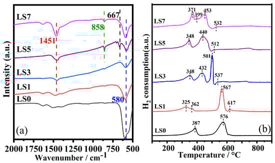 The FTIR spectra of the LSX catalysts are presented in Figure 4a. Among the catalysts with varying amounts of Sr doping, it is observed that the bending vibration of Co-O bonds in the octahedral structure of perovskite BO6 is assigned to approximately 580 cm−1 [32]. This suggests the successful preparation of the perovskite structure. Additionally, the peaks at 858 and 1451 cm−1 are attributed to surface carbonate [33,34]. When considering the XRD results, it is further confirmed that SrCoO3 exists in the samples. Comparing the catalysts before and after Sr doping, it is evident that the characteristic peak of perovskite is significantly weakened upon the introduction of Sr, indicating that Sr has a certain impact on the integrity of the perovskite crystal.