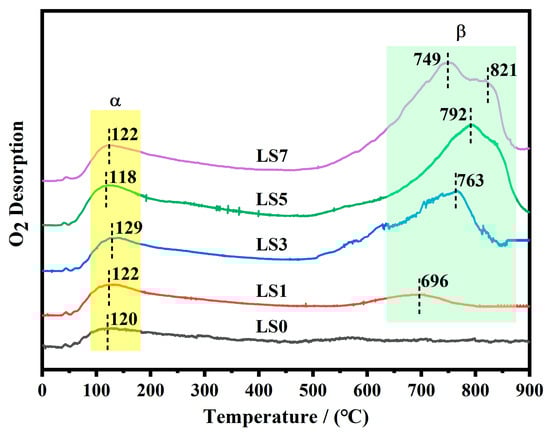 O2 temperature-programmed desorption tests were conducted on the LSX catalysts and the results are presented in Figure 5. The integral areas of the α and β peaks were determined from the O2-TPD spectra, as shown in Table 2. Except for LS0, all LSX catalysts exhibited a α-oxygen desorption peak below 300 °C and a β-oxygen desorption peak above 600 °C. The α-peak in the graph represents the desorption of surface-adsorbed oxygen (O2−) species, whereas the β-peak corresponds to the liberation of lattice oxygen (O2−) ions [38]. The graph displays an upsurge in the intensity of the α-peak during Sr doping, indicating that Sr doping facilitates the desorption of surface oxygen species. Typically, an increase in the concentration of oxygen species associated with the α-peak enhances catalytic activity [12]. Among the catalysts, LS5 demonstrated the lowest α-peak temperature of 118 °C and the largest peak area, indicating a higher concentration of surface oxygen species and stronger oxidation properties. Furthermore, the intensity of the β-oxygen desorption peak increased with Sr doping, with the maximum observed for the LS7 catalyst.