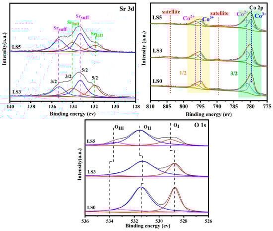 The reducibility of the LSX samples was assessed via H2-TPR, as depicted in Figure 4b. The peaks observed in the temperature range of 100 °C to 800 °C can all be attributed solely to the reduction of Co3+. This finding is consistent with the notion that La3+ and Sr2+ are impervious to reduction under the specific experimental conditions employed [24]. In all catalysts, the reduction peaks witnessed in the 300–430 °C range correspond to the reduction of Co3+, whereas those observed within the 440–620 °C range align with the reduction of Co2+ [35,36]. Specifically, between 300 and 430 °C, there are two reduction peaks for Co3+ with x > 1. The peak at the lower temperature is related to surface/highly reactive Co3+, which is in accordance with the stepwise reduction behavior of fine Co3O4 particles [37]. Notably, the reduction temperature of Co species on the doped catalysts exhibits a noticeable decrease compared to that of the undoped catalyst when the Sr doping level is maintained below 50%. This noteworthy trend alludes to the beneficial influence of Sr doping, which serves to enhance the reduction performance of the catalysts and facilitate the reduction of surface oxygen [24]. However, when X ≥ 5, the intensity of the reduction peak in the range of 500–540 °C decreased significantly. Combined with the XRD results, it is speculated that the reason for this occurrence may be the inhibitory effect of the presence of SrCoOx and SrCO3 impurities on the reduction of Co2+. Furthermore, exceeding a certain threshold of Sr doping leads to a slight elevation in the reduction temperature of Co species, signifying that excessive Sr doping does not favor the reduction process of the catalysts.