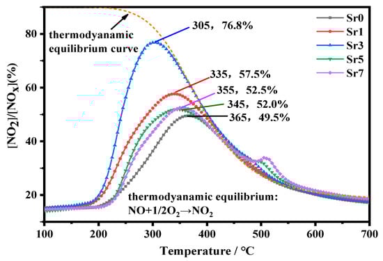 Perovskite (ABO3) catalysts have been widely employed in environmental catalysis due to their low cost, superior thermal stability, and catalytic activity [12]. Alkali or alkaline earth metals have the potential to act as substitutes for the A-site, while transition metals can replace the B-site in perovskite catalysts. Incorporation of alkali or alkaline earth metal dopants plays a vital role in controlling the performance of perovskite catalysts by facilitating the creation of more oxygen vacancies and stabilizing the perovskite structure. The study conducted by Ueda et al. [13] revealed that the incorporation of Ba2+ ions amounting to 30% into La3+-based perovskite (LaFe0.97Pd0.03O3) remarkably tripled the capacity for NOx storage. Similarly, Panunzi et al. [14] synthesized lanthanum strontium ferrite (LSFPt), and investigated how the oxygen vacancy content and the catalyst surface activity were enhanced in combined Sr substitution at the A-site and Pt doping at the B-site of lanthanum ferrites, leading to a substantial improvement in the activity and stability of methane oxidation. Concomitantly, Ji et al. [15] proposed that Sr dopants played a crucial role in enhancing the performance of catalysts during low-temperature reduction. Moreover, substitution of La with Sr in perovskite compounds like LaCoO3 and LaMnO3 exhibited enhanced oxidation activity, effectively converting NO to NO2 [16,17]. Thus, Sr doping at the A site in perovskite catalysts yields improved NO oxidation performance and thermal stability.