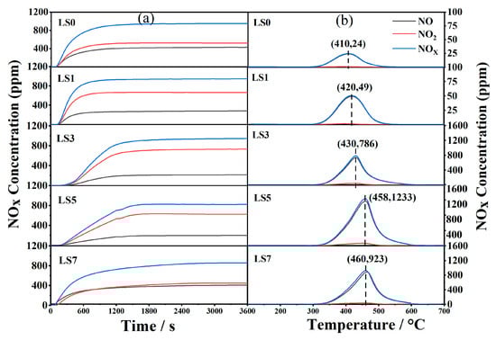 To assess the impact of Sr doping on the efficiency of NOx storage, experiments were conducted to measure the adsorption and desorption of NOx at a temperature of 300 °C. The results are presented in Figure 8. The adsorption curve (Figure 8a) clearly demonstrates that at the initial stage of adsorption, NOx is almost entirely adsorbed. As adsorption progresses, the concentration of NOx at the outlet gradually increases and stabilizes, suggesting that NOx adsorption reaches saturation. Throughout this process, NO2 is detected at the outlet, indicating the oxidation of NO to NO2. Previous studies have indicated that NO2 can be readily stored in the form of nitrate, and the conversion of NO to NO2 is the rate-determining step for NOx storage in Pt/BaO/Al2O3 catalysts [49]. Figure 8b illustrates the desorption behavior of the LSX catalysts. All catalysts exhibit a one-step desorption process. With increasing Sr doping content, the desorption peak of the catalysts shifts to higher temperatures, indicating that the addition of more strontium to perovskite leads to greater stability of the nitrate species.