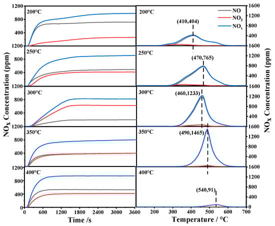 Based on the above studies, it was observed that the LS5 catalyst demonstrates remarkable performance in NOx storage. Therefore, an investigation into its NOx storage capabilities at varying adsorption temperatures (200–400 °C) was conducted. The findings are presented in Figure 9. Initially, the LS5 catalyst completely traps NO, resulting in minimal NOx levels. However, as the reaction time increases, the concentration of NOx gradually rises until it reaches a certain threshold. Based on the NOx concentration at the outlet, the conversion rate of NO can be calculated and is shown in Table 5: 300 °C (63%) > 250 °C = 350 °C = 400 °C (42%) > 200 °C (30%). Analysis of the NOx desorption curve reveals that catalyst desorption follows a one-step process at different temperatures. Moreover, the desorption peak of the catalysts shifts to higher temperatures with increasing temperature. This suggests that elevating the temperature enhances the stability of nitrate.