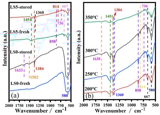 In order to determine the storage species of the samples, FTIR analysis was conducted on the catalysts after NOx storage. The results, depicted in Figure 10, reveal that the predominant adsorbed species on the LSX surface are primarily bulk nitrate (736 cm−1, 814 cm−1), nitrate ions (1360 cm−1, 1384 cm−1) [53], and bidentate nitrate (1502 cm−1) (1502 cm−1) [54,55]. Additionally, the characteristic peak at 580 cm−1 corresponds to the perovskite structure, while peaks at 667, 858, and 1451 cm−1 indicate the presence of carbonate species. Lastly, the peak at 1633 cm−1 is attributed to H2O. Overall, the NOx storage on LS0 and LS5 catalysts follows the “nitrate” route, aligning with the findings of the NOx desorption stage (Figure 8 and Figure 9).