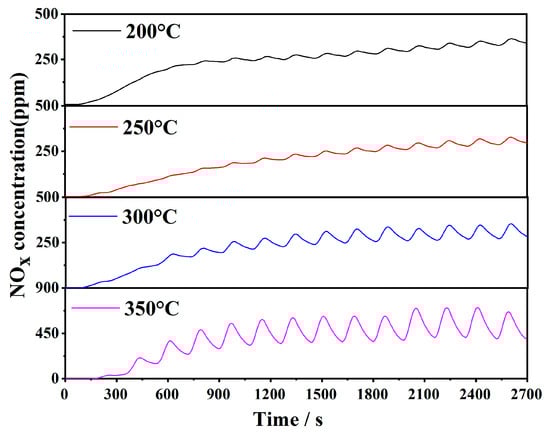 NOx concentration curves of the LS5 catalyst during the NSR process at different temperatures (200–350 °C).