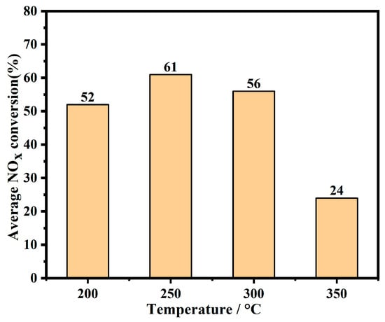 Figure 12 displays the average NOx conversion of the LS5 catalyst at different temperatures. As shown, the catalyst achieves an average NOx removal rate of over 52% within the temperature range of 200–300 °C, with maximum NOx removal of 61% observed at 250 °C. Subsequently, as the reaction temperature increases, the average NOx conversion decreases. These findings align with the adsorption and desorption behavior of NOx. It is likely that the positive correlation between temperature and nitrate stability hampers the decomposition of nitrate and catalyst regeneration, thereby reducing the average NOx removal rate. In conclusion, when utilizing C3H8 as the reducing gas, the LS5 catalyst exhibits a superior average NOx conversion rate at low temperatures.