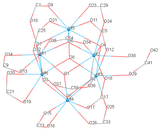 Molecule IV is a hexanuclear hafnium cluster. The arrangement of Hf atoms can be represented in such a way that four of them (Hf1, Hf2, Hf3, Hf6) lie at the base, and two (Hf4, Hf5) at the vertices of a quadrilateral bipyramid (Figure 2). Bond lengths and angles in complex IV are listed in Tables S1 and S2 (Supplementary Materials).