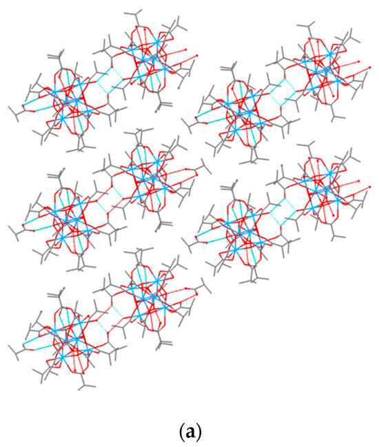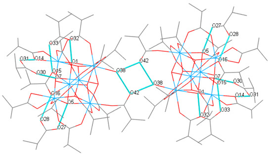 In the crystal structure of IV, hydrogen bonds that arise between the coordination water molecule O38 and the oxygen atom O42 of the monodentate 2-methylpropanoate ligand both inside the Hf hexanuclear cluster and with the neighboring cluster are observed, forming pairs of hexanuclear clusters (Figure 3). Hydrogen bonds are also observed between μ3-OH groups and oxygen atoms of solvating 2-methylpropanoic acid molecules. The parameters of the considered hydrogen bonds are listed in Table 2. Only oxygen atoms of the solvating molecules, which have short C=O bonds, are involved in hydrogen bonds with the μ3–OH groups of the [Hf6(μ3-O)4(μ3-OH)4]12+ cluster core. However, the oxygen atoms of the supposed C–O–H groups have short contacts with oxygen atoms from the coordination environment. Thus, O28…O16 has a length of 2.640 Å; O31…O14 has a length of 2.679 Å; and O33…O15 has a length of 2.719 Å. These contacts can only be explained by the formation of hydrogen bonds. Note that oxygen atoms O14, O15, and O16 belong to two non-bridging η2-chelate 2-methylpropanoate ligands. We calculated the positions of hydrogen atoms at the O28, O31, and O33 atoms, after which they were refined in the rider scheme (See Materials and Methods).