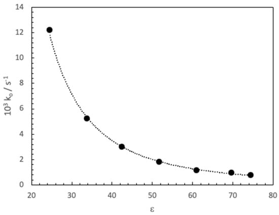 Since the cyclodextrin cavity has a lower polarity than that of bulk water, the influence of the dielectric constant (ε) on the MG basic hydrolysis reaction has also been analyzed using dioxane-water mixtures. For this, ε value was varied between 24.54 and 74.43, maintaining a constant MG and NaOH concentrations ([MG] = 1.46 × 10−5 M and [NaOH] = 9.98 × 10−4 M). A significant decrease in the rate constant was observed as the dielectric constant increased (Figure 2).