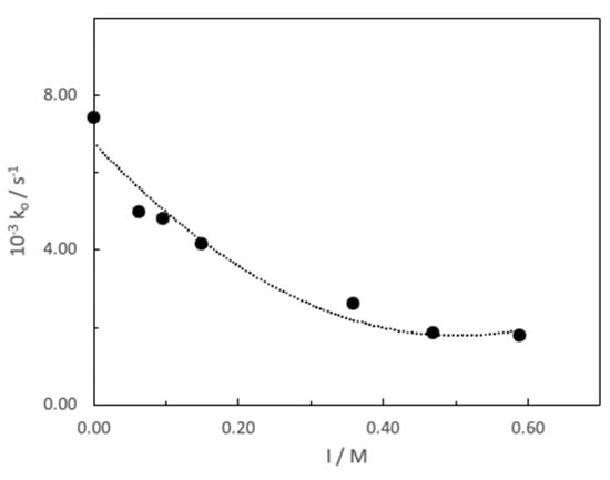 An interesting piece of information would be the evaluation of the radius of the activated complex for the reaction using the double sphere model [28]. From the fits of the experimental data to Equation (1)—where zA and zB are the ions charge, e is the electron charge, ε the dielectric constant, σ≠ is the active complex radius and k0 is the rate constant in a high dielectric constant medium (e = ∞) (Figure 3) we obtain a value for the radius of the complex σ≠ 5.1 Å (R2 = 0.9803).