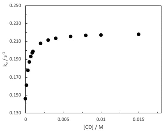 Once the basic hydrolysis reaction of MG in an aqueous media has been characterized, the alkaline hydrolysis of MG in the presence of β-CD has been analyzed. The hydrolysis reaction is assessed by varying [CD] between 0 and 0.015 M. As can be seen in Figure 6, a catalytic effect of β-CD is observed in this reaction. Indeed, the observed rate constant increases as the concentration of CD present in the medium increases until reaching a leveling off.