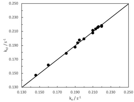 The fit of Equation (2) to the experiment results yields a value of the pseudo-first orther rate kw = 1.47 ± 0.01 mol−1s−1, which is compatible with the value obtained in water kw = 1.46 ± 0.03 M−1s−1 (vide supra) [23]. The value of catalytic constant in the presence of CD was estimated as kCD = 0.25 ± 0.03 s−1. In this sense the ratio kCD/kw was 0.17, which is so close to the equivalent ratio for basic hydrolysis of CV (kCD/kw = 0.15) obtained in previous experiments [30]. The binding constant of MG to CD was evaluated in KS = 2500 ± 50. Figure 7 shows the experimental results compared to those obtained from adjusting them to Equation (1). As can be, this was satisfactory. Indeed, the solid line represents the adjustment of ko and ko,t values to the slope 1 line, for which a value of R2 = 0.9989 has been obtained. This R2 value demonstrates the good fit of the theoretical model to the experimental data.
