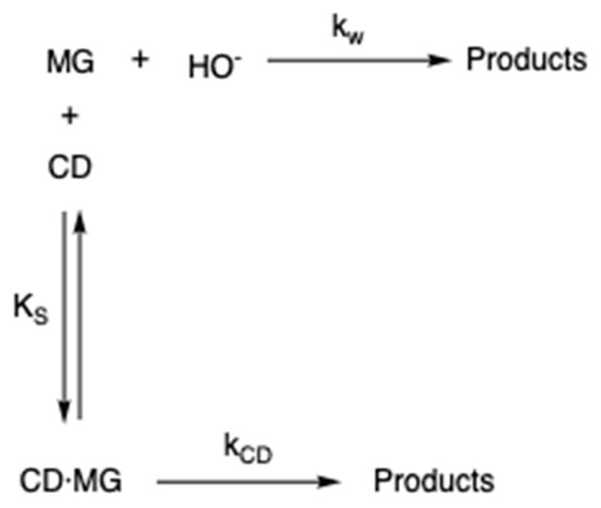 A kinetic model has been applied to the study of the basic hydrolysis of MG in the presence of cyclodextrins. From the reaction mechanism, the kinetic constants of the hydrolysis processes have been obtained (in water and through the formation of the MG-CD host-gues complex) as well as the association constant of MG to CD. A comparison of the rate constants observed in the presence and absence of CD reveals that a catalysis of the hydrolysis process associated with the reaction between MG and deprotonated cyclodextrin occurs. Likewise, from the experimental data, no kinetic evidence is observed that an attack by HO− on the MG-CD occurs. In this way, a kinetic model has been proposed that considers two simultaneous routes in the aqueous medium that involve free hydroxyl ions and the hydroxyl belonging to the deprotonated CD, respectively. Likewise, from the observed results it is suggested that the stoichiometry of the host-guest complex between the CD and the MG is a 1:1 complex. The values obtained for both the kinetic constants and the equilibrium constant are in line with values of similar substances in the literature [24,34], which constitutes another proof of the validity of the proposed kinetic model.