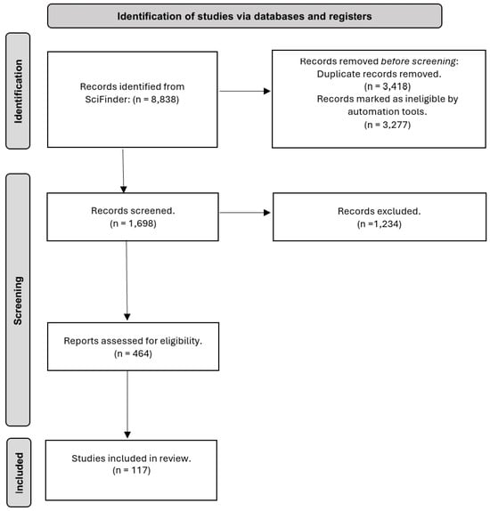 Step 1—We systematically retrieved the articles from the SciFinder database using automation tools to first filter the criteria established for the review as shown in Figure 1. Keywords included “natural products”, “isolation”, and “new compounds”. The selected records were required to have been published between 1 January 2021 and 31 December 2022. We excluded case reports, letters, other reviews, books, patent articles, meeting abstracts, and non-English articles.