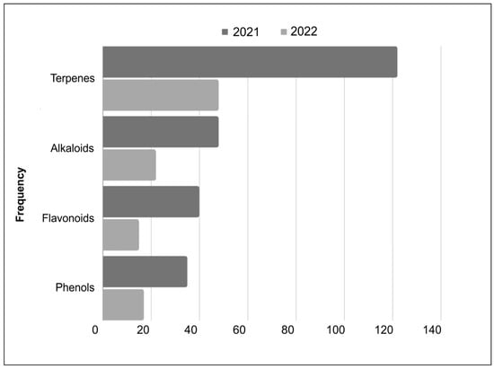 The compound classes with the highest frequency and variety in different botanical species identified in this study were terpenes, alkaloids, phenols, and flavonoids (Figure 2).