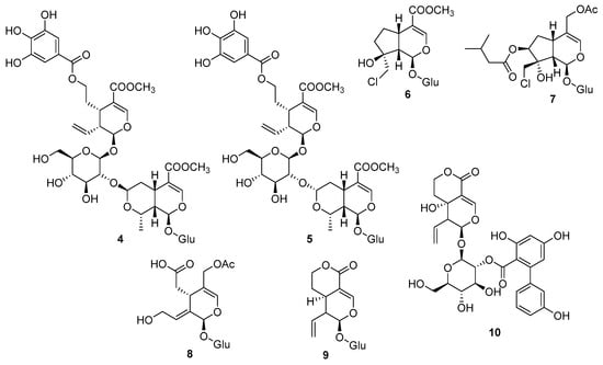Figure 4. Chemical structures of Cornusdiridoids (45), chlorine-containing iridoid glycosides (67), and secoiridoids (810).
