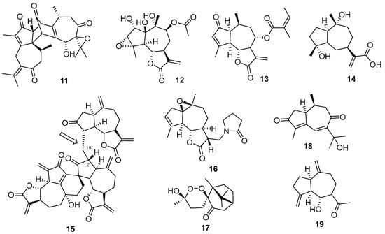 An unusual guaianolide trimer (15) was found in Ainsliaea fragrans Champ. (Compositae), a plant with medicinal use as an antibacterial and anti-inflammatory effect [61] (Figure 5). The third sesquiterpene unit is attached to C2′, providing a rare linkage (C2′-C15″). Cytotoxicity results showed this compound being active against five cancer cell lines with IC50 values of 0.4–8.3 μM. Compound 16 is notable for the presence of a γ-lactam group [35], while 17 has an unusual 1,4-peroxy hemiacetal xanthanolide skeleton [62]. Other minor structural modifications can be found in the reported sesquiterpenes 18 and 19 [63].