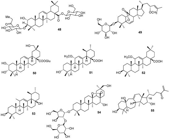 Regarding diterpenes, a new ent-kaurane diterpenoid compound named daturoside A (30) (Figure 8) was obtained from the pericarp of Datura metel L. from the Solanaceae family [76]. The authors indicate anti-inflammatory action through the production of nitric oxide (NO) induced by lipopolysaccharide (LPS). The compound hupehenoside A (31) was obtained from Inula hupehensis (Y. Ling) Y. Ling and has a carbon bond in the glycosidic structure and a carboxylic acid in the cyclic structure [77]. Wang et al. (2022) also identified another 15 new compounds with a similar structure, with slight variations in the hydroxyls of the sugars (mostly acetylation substitutions). The authors evaluated the neuro-anti-inflammatory activity, and only one of the compounds showed inhibition of NO production.