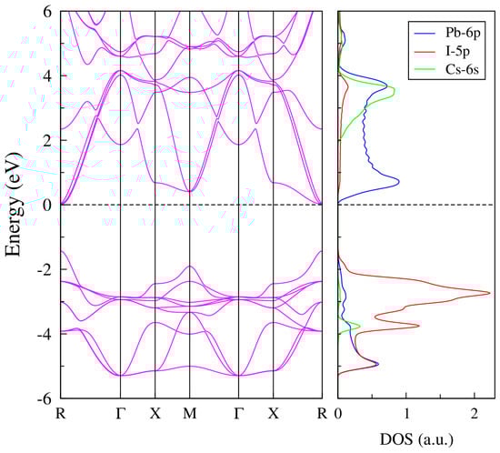 In Figure 2, we show our results for the band structure and atom-resolved DOS along the Brillouin zone high symmetric path. The one-particle band structure of cubic CsPbI3, from −6.0 eV to 6.0 eV with the Fermi level being the origin of energy, is shown in the left panel of Figure 2. This figure shows that cubic CsPbI3 crystal is a direct R-point bandgap semiconductor. This intrinsic bandgap behavior is known to be relevant for solar cell materials, because the system transmits the absorbed light more efficiently than other indirect band gap materials, enabling higher optical absorption or optical conductivity [10]. Based on the SIESTA code, the calculated bandgap for cubic CsPbI3 is approximately 1.45 eV. Although this value is underestimated compared to the estimated experimental value of 1.73 eV, our bandgap is found to be consistent with the 1.35 eV value found by Z. Wang et al. [33] for cubic CsPbI3. Moreover, our results for the partial density of states (DOS) are also consistent with that reported by Ahmadi et al. [10], showing that the bottom of the conduction band minimum is composed mostly of the orbitals of lead and the valence band maximum is originated by orbitals of iodine atom, with clear Pb-I hybridization which gives rise to bonding-antibonding bands. Also interesting is the intensity of partial DOS of the I atom, showing a highest valence band edge peak as compared to the one seen in the conduction p band DOS of Pb.