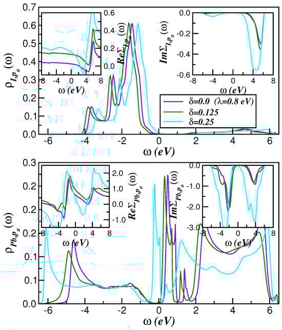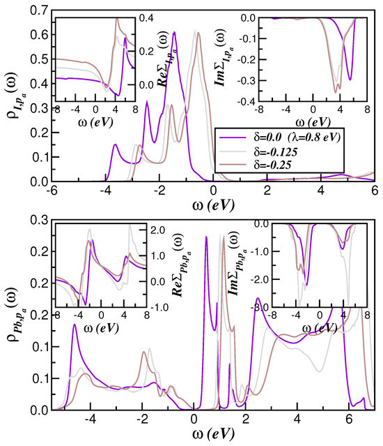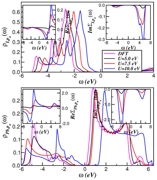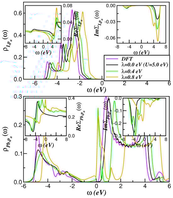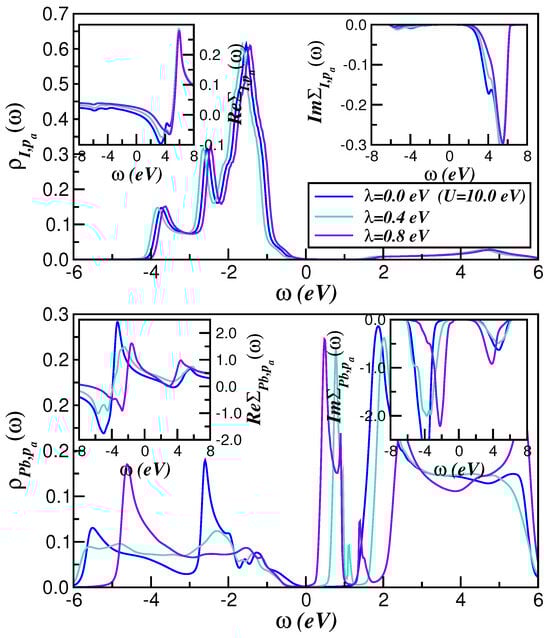 Figure 5 displays the role played by the SO interaction within the intermediate correlated electronic state of cubic CsPbI3. As seen, the metallic state, which has emerged in the weakly correlated regime in Figure 4, is no longer present at eV and eV, where the spectral function and self-energies of Pb show characteristics akin to correlated semiconductors [64,65,66]. Although this emergent insulating state is due to the influence of one-electron hybridization and is adiabatically connected to a band insulator, it preserves specific features associated with electron correlations just above the bandgap. Thus, the insulating features seen in the lower panel of Figure 5 are partially related to the -dependence of (see inset of Figure 5) in a channel where vanishes in the gap region. Although some correlated semiconductors might show mixed Mott and Kondo insulating states, the insulating state in the Pb-channel of cubic CsPbI3 is an interesting demonstration of a Kondo insulator, since the hybridization gap is intrinsically associated with vanishing , rather than its divergence as found in Mott insulators.