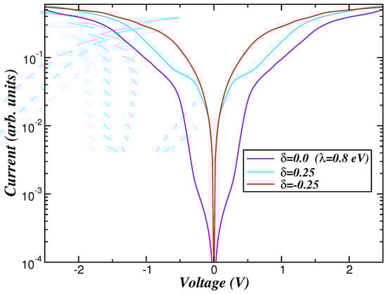 Finally, in order to clarify the interplay between channel-selective metallicity and electron/hole-doping effects into the evolution in the characteristic of CsPbI3 memristor in Figure 8, we display our DFT+DMFT results obtained for three different values considered in Figure 6 and Figure 7. Firstly, within the wideband limit of the electrodes, the current formula reads [108,109], where , with being the coupling strength between the right (R) and left (L) electrode ( = L,R) and the central region [110,111], and . and are, respectively, the Fermi function of the electrode and the total DOS of the and channels with spin- of CsPbI3 memristor. Secondly, here we suppose a symmetric voltage drop, , with constant DOS for the leads. As shown in Ref. [112], these assumptions allow for a microscopic description of the characteristic of cubic CsPbI3.