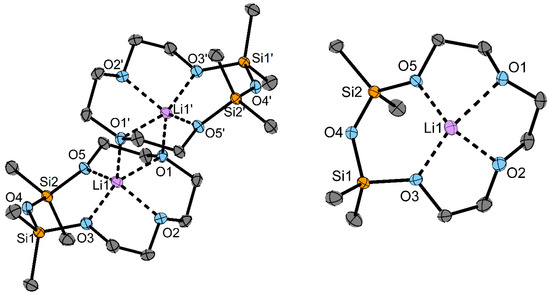 Compound 3 crystallizes in the space group P21/n with one DCM molecule in the asymmetric unit (see Table S1 and Figure S31 for details). In the solid state, the formation of a dimer is observed by coordinating the Li atoms from four O atoms of one ligand and one O atom from another ligand to obtain a total coordination number (c. n.) of 5. The siloxane fragment is not coordinating, which underlines the weaker coordination ability of siloxane fragments compared to crown ethers. The distances of coordinating O atoms of the ligand to the Li atom are mostly in the range of 197.1(5)–198.7(5) pm; only O1 has a longer distance to the cation (223.0(5) pm), which is due to the coordination of two Li atoms. The complexes in the literature [Li(1,2-disila [12]crown-4)]SO3CF3 and [Li([12]crown-4)]SCN show slightly longer Li–O bonds in the ranges of 199.4(4)–212.6(4) pm and 205(1)–214(1) pm [23]. The siloxane angle in 3 of 138.3(1)° is slightly smaller than that of the non-coordinated siloxane fragments in the complex [Li(D6)][GaI4] (D6 = (SiMe2O)6) of 145.1(1)° [19].