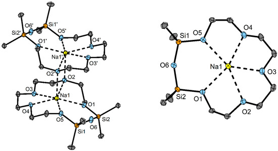 In recent works, we obtained a variety of coordination compounds of all alkali and earth alkali metal cations except beryllium with cyclosiloxanes with ring sizes up to (SiMe2O)9 (short D9) [19,20,21,22]. Crown ether complexes of these metals have been known for a long time and have been well examined [10,11].
