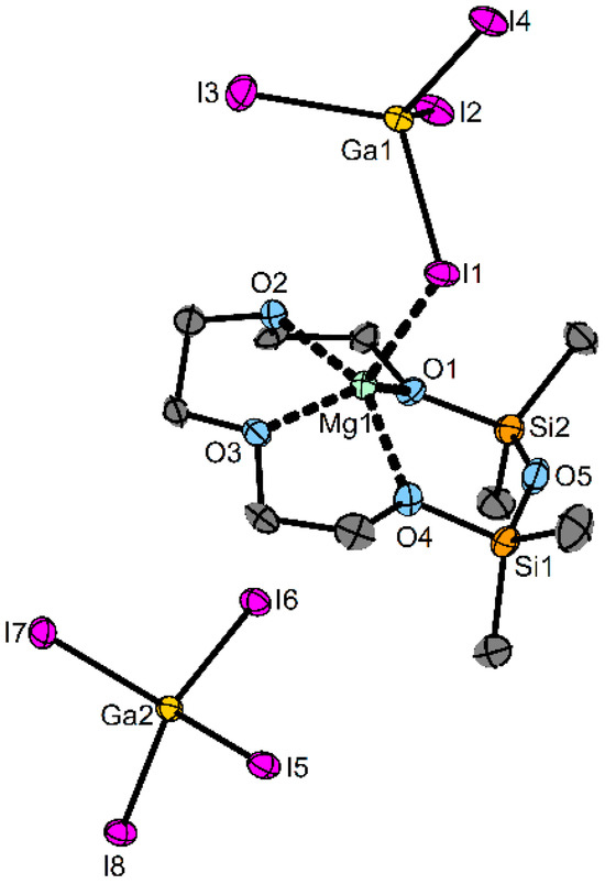 Compound 5 crystallizes in the space group P21/n with one molecule in the asymmetric unit. In contrast to the alkali metal ions, no dimerization of the cations appears in the solid state. Instead, one [GaI4]− ion coordinates the Mg atom in addition to the four carbon-bonded O atoms (c. n. 5). Even the very Lewis-acidic Mg2+ does not lead to a coordination of the siloxane fragment in the solid state. The distances of the four coordinating O atoms are in the range of 200.1(5)–203.5(5) pm, which is shorter than in [Mg(1,2-disila[15]crown-5)Br2] (222.3(2)–235.1(2)) pm due to the larger ring size in the literature. Compared to [(Ar[tBu]N)3Ti(μ-O)([12]crown-4)Mg(μ-CO3)Ti(N[tBu]Ar)3] (Ar = 3,5-Me2C6H3, 217.9(4)-226.3(4) pm), 5 has shorter O–Mg bonds due to the fact that the Mg2+ ion is located outside the crown ether. The Si–O–Si angle of 146.0(3)° is smaller than in the non-coordinating siloxane fragment in [Mg(D6)I2] with 161.2(1) [21,25].