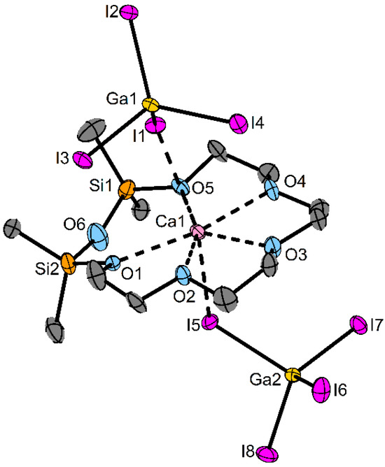 For the bigger Ca2+ ion, we used 2 as a fitting ligand to obtain [Ca(TeEGDS)][GaI4]2 (6). For details of the synthesis and characterization see Supplementary Material (Figures S15–S17 and S22). The reaction was unselective in DCM but selective in fluorobenzene. The molecular structure of 6 is shown in Figure 4.