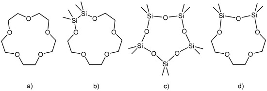 Examples of (a) crown ethers, (b) hybrid crown ethers bearing Si2Me4 units, (c) cyclosiloxanes and (d) this work.