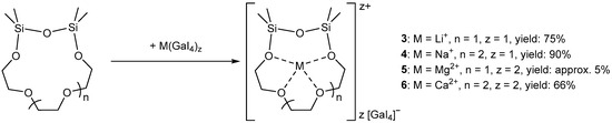 - Dankert, F.; Donsbach, C.; Rienmüller, J.; Richter, R.M.; von Hänisch, C. Alkaline Earth Metal Template (Cross-)Coupling Reactions with Hybrid Disila-Crown Ether Analogues. Chem. Eur. J. 2019, 25, 15934–15943. [Google Scholar] [CrossRef] [PubMed]