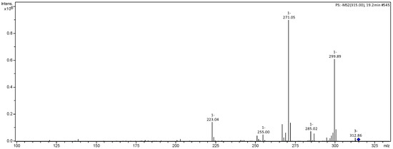 Considering the fragmentation patterns, deprotonated molecule ions, and fragments, it was possible to observe five compounds, three being flavonoids (compounds 1–3) and two being caffeic acid derivatives (4–5). Based on the literature consulted, these compounds correspond to luteolin (1) [20]; rhamnetin (2) [20,21]; a luteolin derivative (3) [20]; caffeic acid hexoside-O-pentoside (4) [22]; and caffeic acid hexoside dimer (5) [23]. The spectra of the five noted compounds are shown in Figure 4, Figure 5, Figure 6, Figure 7 and Figure 8.