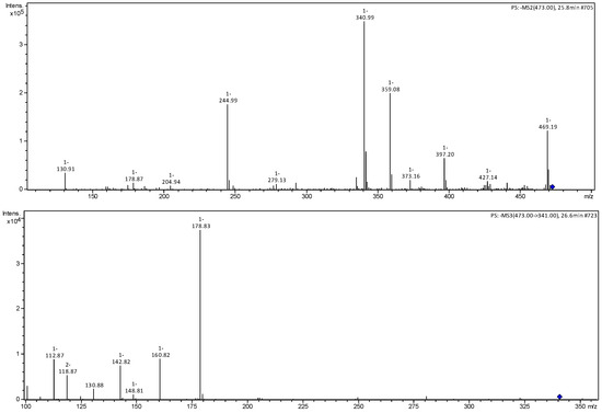 Compound 4 presented an ion of the deprotonated molecule at m/z 473 [M−H]−, with characteristic fragmentation ions at m/z 455 [M−H−H2O]−, 427 [M−H−CO2]− and 341 [M−H−pentose]−. The MS3 spectrum of the m/z 341 ion presented fragmentation ions m/z 179 [M−H−Hexose]−, corresponding to aglycone, and 161 [M−H−Hexose-H2O]−, corresponding to the loss of a water molecule, and being identified as caffeic acid hexoside-O-pentoside [22]. Compound 5 was identified as a dimer of caffeic acid hexoside by the m/z 683 [M−H]− ion and fragmentation ions m/z 341, corresponding to a unit of caffeic acid hexoside and 179 corresponding to the aglycone [22,23].