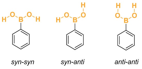 As explained in the Section 2, for each of the arylboronic acids, a comprehensive scan was performed to identify all the low-energy conformations. The searches were conducted by selecting the relevant dihedral coordinates and sampling the conformational space, encompassing all the possible combinations of angles. Geometries were optimized without constraints. Hessian calculations were performed only for non-equivalent geometries. Regarding the unsubstituted phenylboronic acid, the rotation of its two O–H bonds leads to four conformations, two of which are mirror images and therefore have the same energy and vibrational frequencies. The two torsion coordinates are measured by the dihedral angle calculated using the atoms C–B–O–H. The configuration is labeled anti/syn according to whether the dihedral angle is 180° or 0°, respectively. In Figure 1, the most common minimum conformations of the hydroxyl moieties are shown for the phenylboronic acid.
