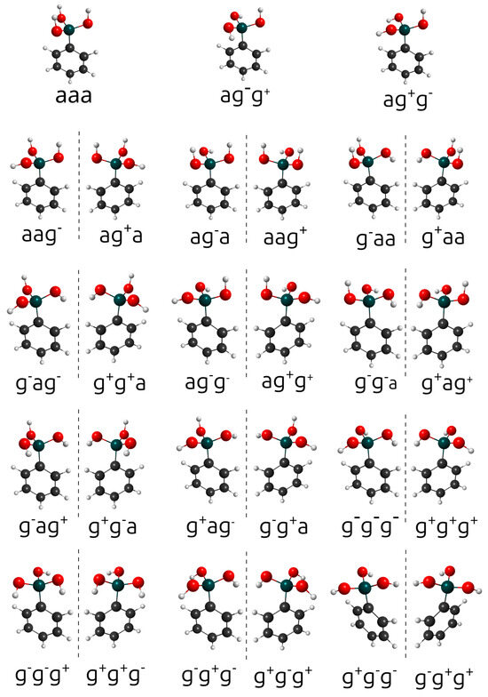 Twenty-seven conformations of the phenylboronic conjugated base. The mirror images are separated by dashed vertical lines. The labels a, g+, and g− represent anti, gauche+, and gauche−, respectively.
