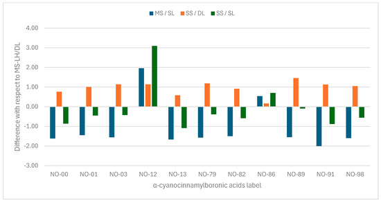 In some cases, a compensatory effect may occur if is similarly large for both the acid and base forms. As seen in Table 2, the largest difference is observed for NO-89, corresponding to the tallest orange bar in Figure 3. On the other hand, the smallest difference occurs for NO-86, represented by the shortest orange bar. Since the conjugate base has more conformations than the acid, the MS correction is expected to be more significant for the former. The presence of a substituent in the meta position reduces the ratio in comparison to the same substituent in para, as discussed above. This reduction is more pronounced for the base than for the acid, resulting in a net decrease in the difference between the pK values calculated under the MS and SS approximations.