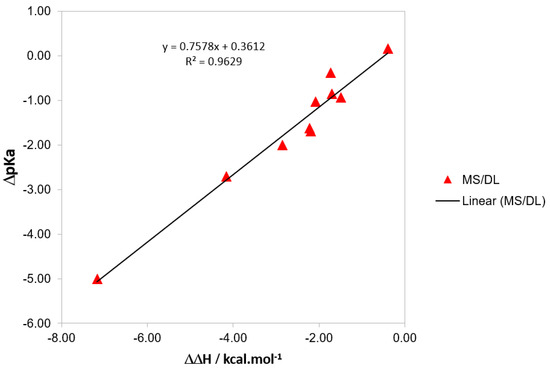 There is a correlation between the variation in pKa and that in reaction enthalpy, as shown in Figure 4. It could be argued that this would be the main contributor to the variation in reaction enthalpy, i.e., energetic or thermal correction. The latter arises from the temperature variation in the total partition function, while the former is the change in electronic energy, nuclear repulsion, and vibrational zero-point energy. Although thermal correction is important for the consistent final calculation of pKa values, the main contributor to is the reaction energy ΔE (the difference in the total energy of the products and reactants). No correlation is found against the variation in entropy.