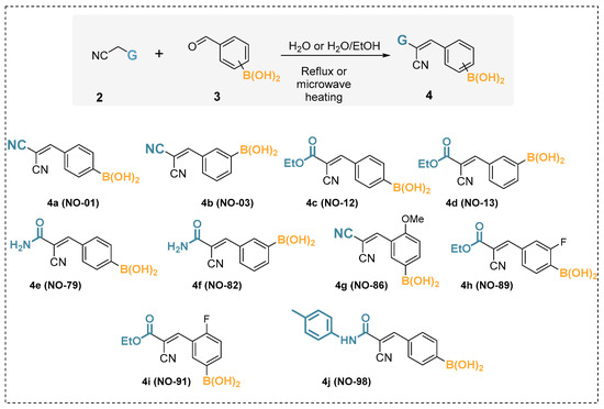 The boronic acids (4a–j) were synthesized by Knoevenagel condensation between arylboronic acids containing the formyl group and active methylenes such as malononitrile and cyanoacetic acid derivatives (Scheme 1). In this obtained series of boronic acids, the aromatic ring of arylboronic acid is linked to an electron-poor vinyl system CH=C(CN)G, where G can be a nitrile or an ethoxycarboxyl, or even an amidic carboxyl. The compounds synthesized by the Knoevenagel reaction were considered as cyano derivatives of borated cinnamic acids, and these compounds were referred to as α-cyanocinnamylboronic acid derivatives. These organoborons were chosen because they are considered relevant from the medicinal chemistry point of view due to the potent anti-inflammatory activity associated with the selective inhibition of the purinergic receptor P2X7, a biological target of great interest for the development of new anti-inflammatory therapies [21,22]. The boronic acids studied in the present work (4a–j) were reported in previously published articles, which involved anti-inflammatory activity. In those works, laboratory codes were given to the molecules (NO series). Thus, so that the reader can maintain comparison with previous works, the NO codes are given in parentheses.
