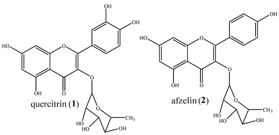 The following supporting information can be downloaded at: https://www.mdpi.com/article/10.3390/compounds5030030/s1, Figure S1: 1H-NMR spectrum of quercitrin (methanol-d4, 400 MHZ), Figure S2: 1H NMR spectrum expansion of quercitrin, Figure S3. 13C NMR spectrum of quercitrin (methanol-d4, 100 MHZ), Figure S4: Expansion of the 13C NMR spectrum of quercitrin, Figure S5: Expansion of the 13C NMR spectrum of quercitrin, Figure S6: Mass spectrum of quercitrin with MS/MS 447, Figure S7: 1H-NMR spectrum of afzelin (methanol-d4, 400 MHZ), Figure S8: 1H NMR spectrum expansion of afzelin, Figure S9: 13C NMR spectrum of afzelin (methanol-d4, 100 MHZ), Figure S10: Expansion of the 13C NMR spectrum of afzelin, Figure S11: Expansion of the 13C NMR spectrum of afzelin, Figure S12: Mass spectrum of afzelin with MS/MS 431.