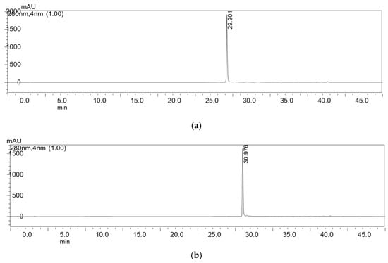 Chromatograms of compounds 1 (a) and 2 (b) after isolation by preparative HPLC.