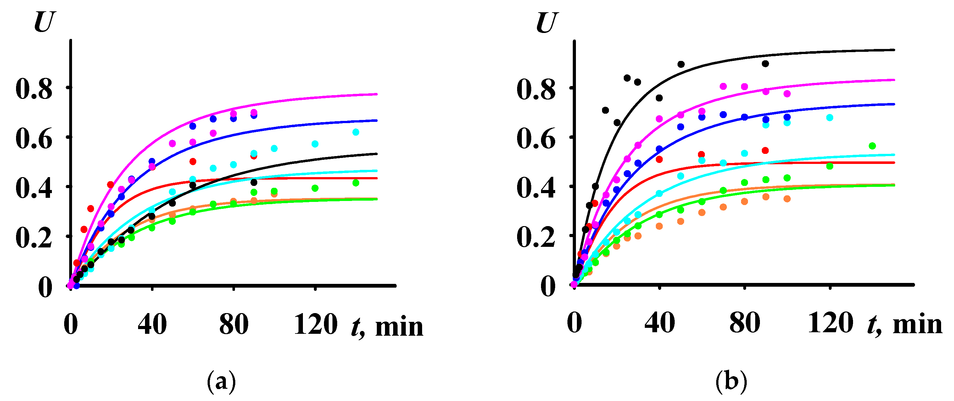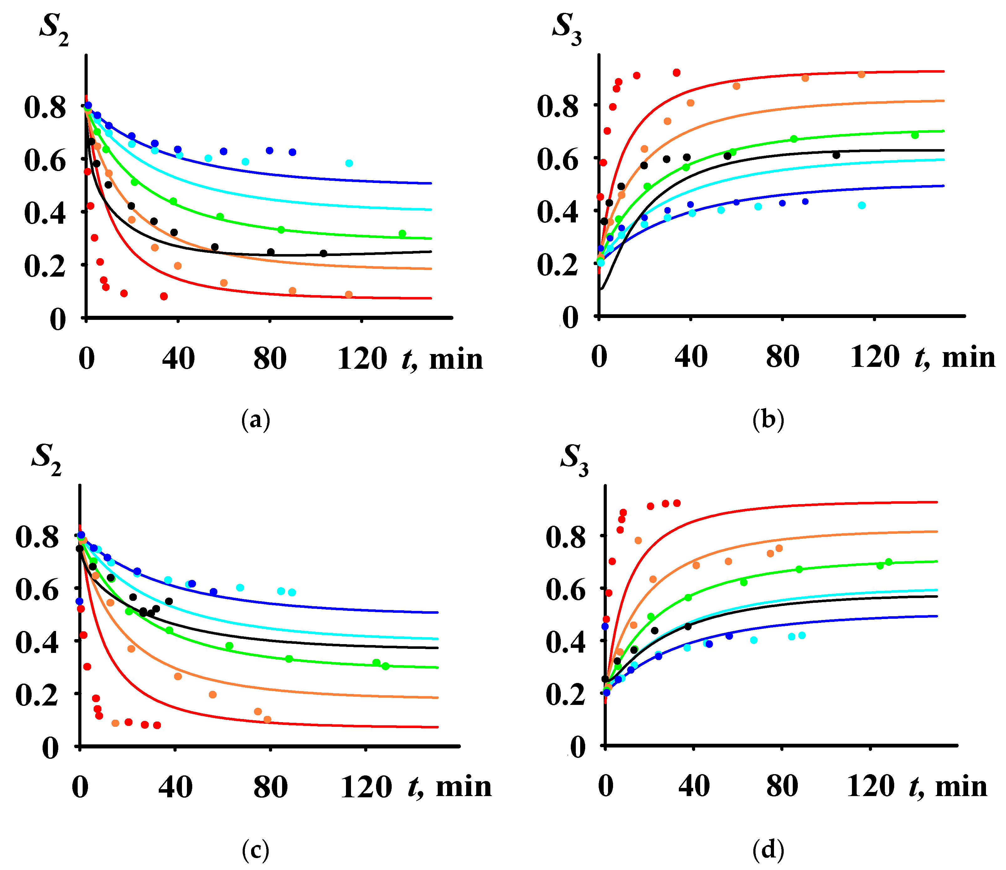3.2. Assessment of the Adequacy of the Kinetic Model and the Accuracy of Its Parameter Estimation