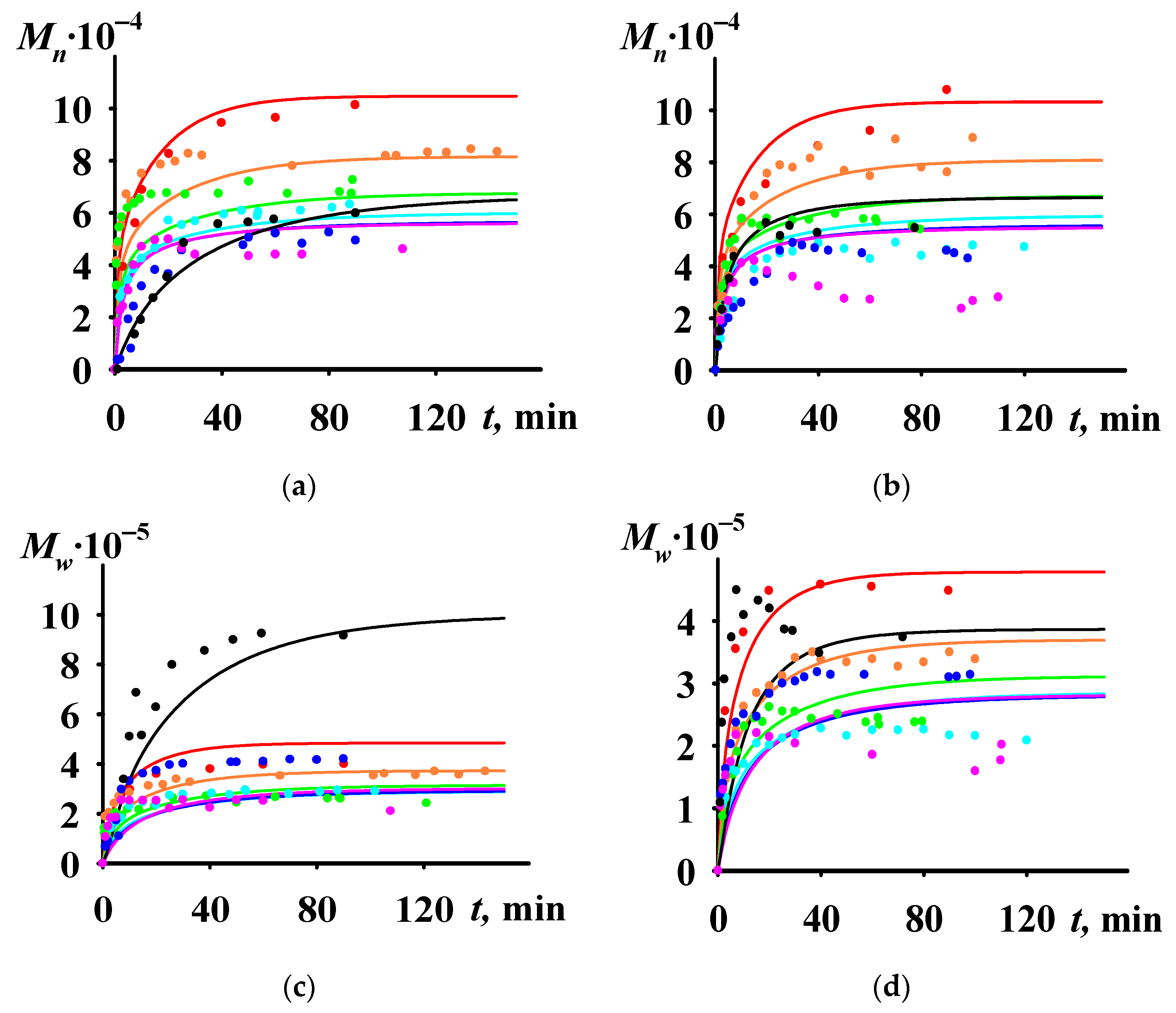 - The kinetic model equations do not allow for the calculation of the isomeric composition of copolymer units and their stereoregularity. This was done intentionally to avoid complicating the kinetic model equations. If such calculations become necessary, the kinetic model equations can be modified. Each chain propagation reaction can be split into separate reactions, each leading to the formation of a monomer unit with a specific structure. The rate constants of these reactions can be identified to describe the experimental isomeric composition of the copolymer units. The fractions of triads of units in the copolymer composition can be calculated based on the isomeric composition of its units within Markov statistics.