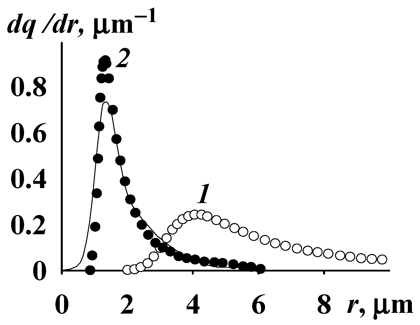 - Based on the CFD model of breakage of TiCl4 + Al(i-Bu)3 catalytic system particles (the equations of which are presented in Table 1), calculations of the particle size distribution by equivalent radius dq/dr after exiting the tubular turbulent apparatus with the diffuser–confuser design were performed using the Fluent module of the ANSYS Workbench 17.1 platform. The composition of the reaction system in the calculations corresponded to the case of butadiene homopolymerization (q = 1, the extreme right point of the dependence ). For each new turbulence condition of the reaction system arising from changes in the geometric parameters of the tubular turbulent apparatus and the feed velocity of the reaction system, a separate CFD model calculation was carried out. Each such calculation yielded its own particle size distribution dq/dr.