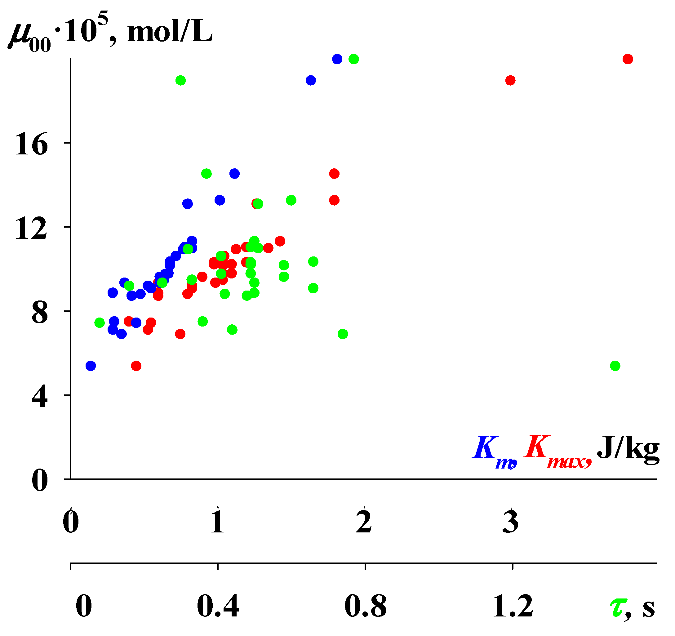v, m/s | Kmax × 101, J/kg | Km × 101, J/kg | τ, s | (1 + a + b)[A]0 × 104, mol/L | μ00 × 105, mol/L at q = 0.76 | μ00 × 105, mol/L at q = 0.85 |