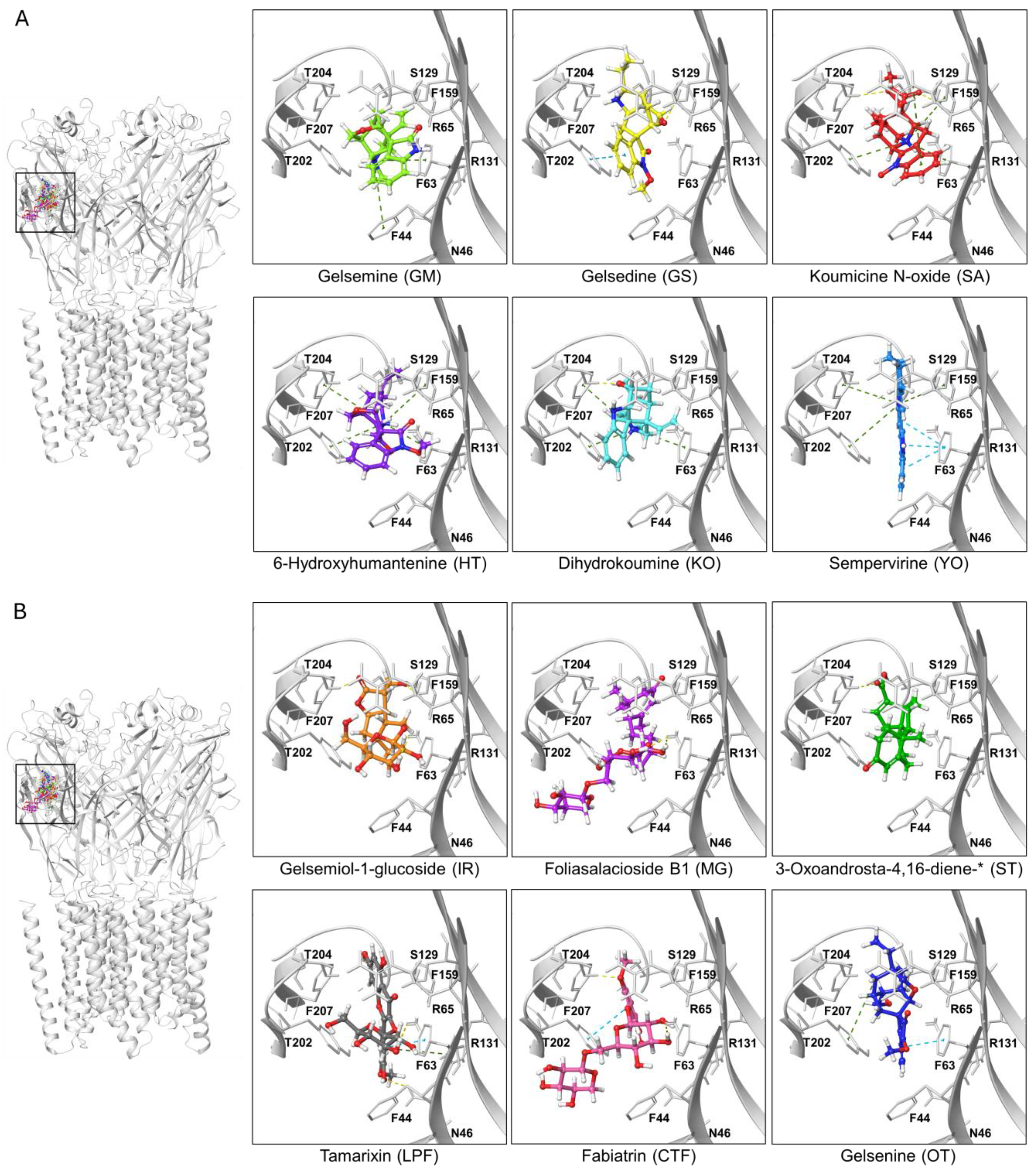 - Marileo, A.M.; Lara, C.O.; Sazo, A.; Contreras, O.V.; Gonzalez, G.; Castro, P.A.; Aguayo, L.G.; Moraga-Cid, G.; Fuentealba, J.; Burgos, C.F.; et al. Molecular Pharmacology of Gelsemium Alkaloids on Inhibitory Receptors. Int. J. Mol. Sci. 2024, 25, 3390. [Google Scholar] [CrossRef] [PubMed]