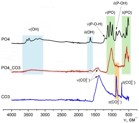 Figure 3. FTIR spectra of synthesized PO4, PO4_CO3, and CO3 powders.