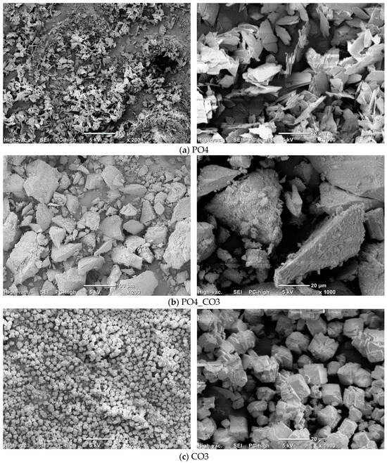 The particles of PO4 powder (Figure 4a) with a size of 10–20 microns and a thickness of 1–2 mm have a lamellar morphology characteristic of brushite (CaHPO4·2H2O) [64]. The particles of CO3 powder (Figure 4c) with a size of 10–20 mm have the cubic shapes, which is typical for calcite (CaCO3) [65]. The PO4_CO3 powder (Figure 4b) is composed of large aggregates of 5–60 mm in size, consisting of particles less than 1 mm in size. Hydroxyapatite powders synthesized by precipitation from solutions, as a rule, consist of particles having a size of less than a micron [66]. It was estimated that the mass (33.5 g) of the synthesized PO4_CO3 powder after drying was 8.4 g higher than the expected (25.1 g) mass of the powder (Table 4). The mass of reaction by-product (PO4_CO3_by) isolated from the mother liquor was 11.8 g less than the expected (37.3 g) mass. Thus, after drying and grinding in a mortar, KCl (reaction by-product) retained in the synthesized powder acted as a binder, binding hydroxyapatite particles in large aggregates visible in the micrographs (Figure 4b).