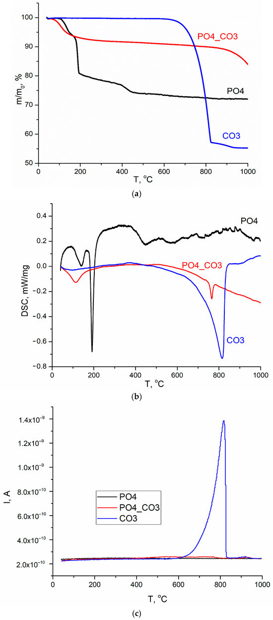 According to the TGA data (Figure 5a), the total weight loss at 1000 °C for PO4_CO3 powder was 16.2%. Three sections can be distinguished on the curve of mass versus temperature for PO4_CO3 powder: removal of physically bound water (7.5% mass loss), which proceeds with heat absorption in the range of 43–240 °C; a section of smooth weight reduction (2.6%) in the range of 240–829 °C; and a section of mass loss (6.1%), apparently related to the removal of KCl, in the range of 829–1000 °C. The endothermic peak at 765 °C, clearly seen on the DSC curve (Figure 5b), can be attributed to the melting of KCl, since according to the estimation (Table 4), the mass of the retained reaction by-product (KCl) in the PO4_CO3 powder was the maximum. No endothermic peaks that could be attributed to the KCl melting process were found in the DSC graphs for PO4 and CO3 powders synthesized for comparison. Significantly lower values of the ion current can be seen on the curve m/z = 44 (CO2) for PO4-CO3 powder (Figure 5c) in wide ranges of 460–800 °C and 900–940 °C than for CO3 powder.