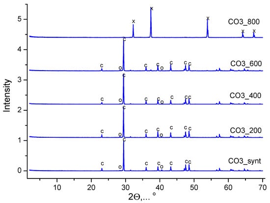 Figure 6. XRD data of CO3 powder after synthesis and after heat treatment at different temperatures. с—calcium carbonate (calcite, CaCO3) (PDF card No 5-586; No 96-210-0190); о—potassium chloride (sylvine, KCl) (PDF No 41-1476; No 96-900-8652); х—calcium oxide (CaO) (PDF No 37-1497, No 96-101-1096).